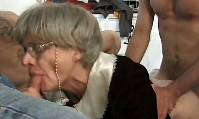 Grandma gangbang slut pleasuring several dicks